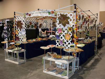 My spousal unit and I have "discussions" all the time about decorations in our booth. Granted, considering all we have to transport (and really don't want to expand beyond our truck), there isn't a lot of room for extra frills. Of course, being a man, he sees no reason for it, but I know that I'm more attracted to a booth that has sparkles, a pretty cloth backdrop or flowers, as most women are. (I'm just making generalizations ~ some men are attracted to stuff like that too ~ heck, my dad collects dolls!). The only concession he has made encompasses some small leaves covered in glitter (craft store-after Xmas sale) that I hang around the signs and frame.